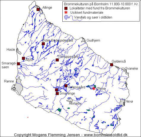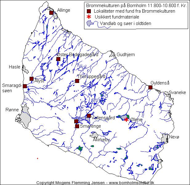 På kortet herover vises lokaliteter på Bornholm, hvor der er fundet redskaber af flint og hjortetak fra Brommekulturen, som er de tidligste fund af menneskelig aktivitet på Bornholm. Pladserne knytter sig til søer og vandløb på tørre og grusede bakker. Den dengang største sø på Bornholms var Vallensgårdmosen og den har på grund af gode jagtbetingelser, tiltrukket jægerne, 3 pladser er fundet i søens nærhed.