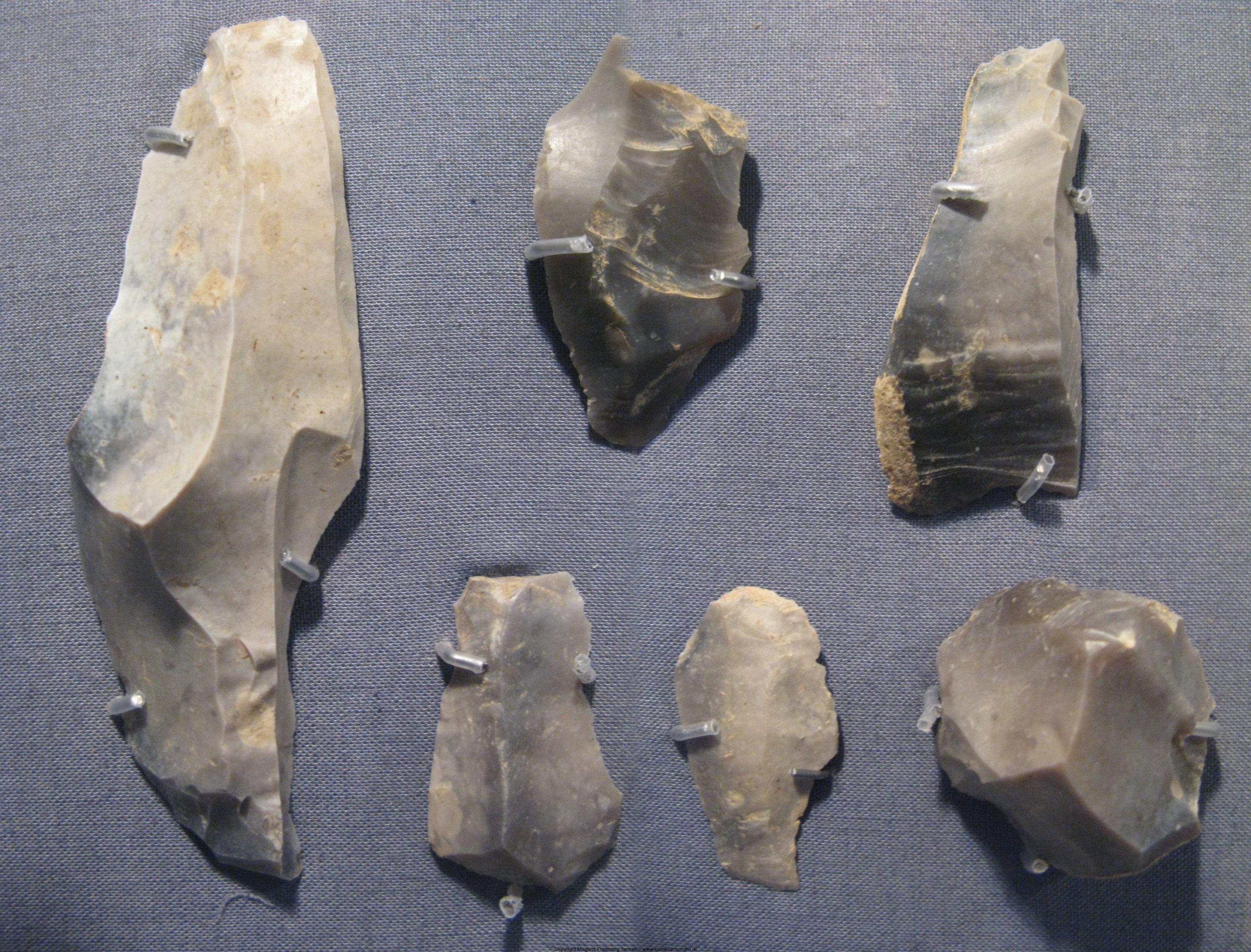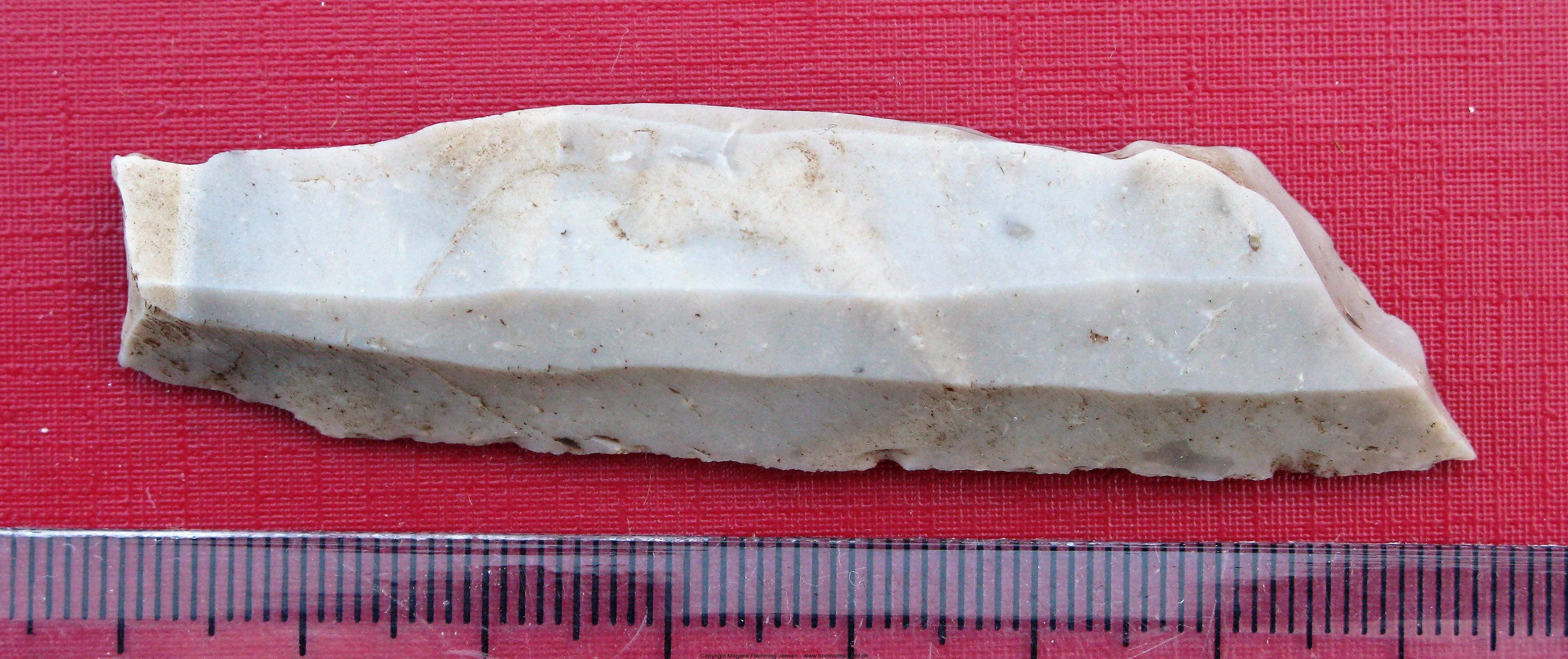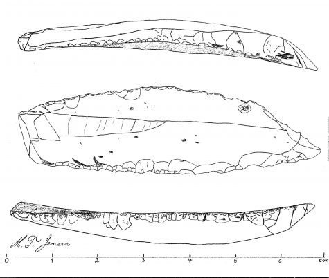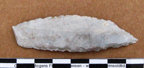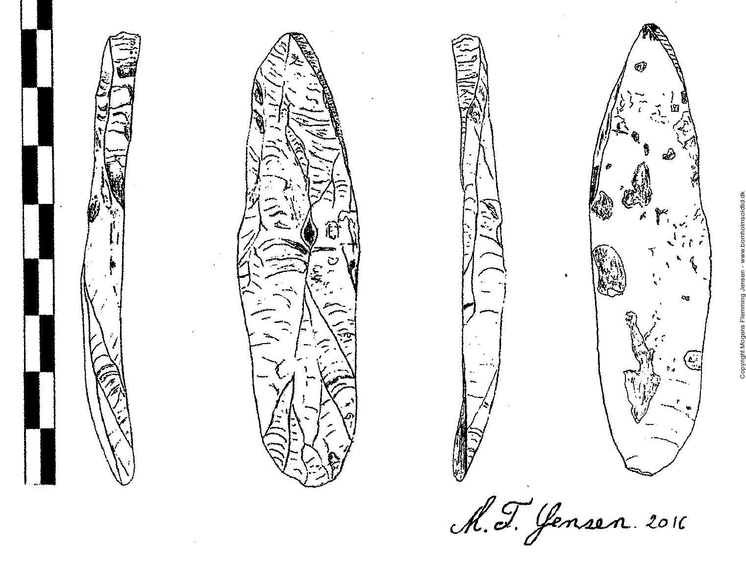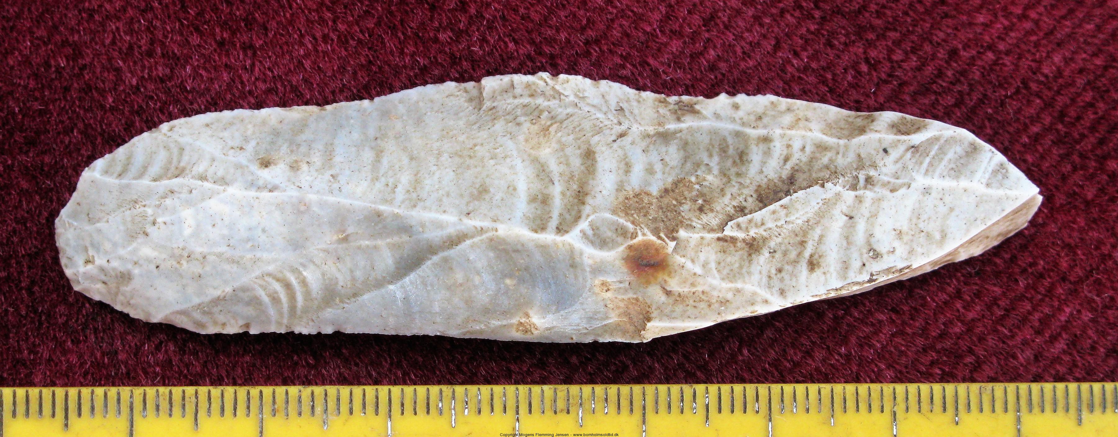 Herover ses den zinken-lignende pren fra Øster Bedegadegård. Bemærk den kraftige retoucheringen langs værktøjets kant som viser at flinthuggeren var omhyggelig med udformningen.