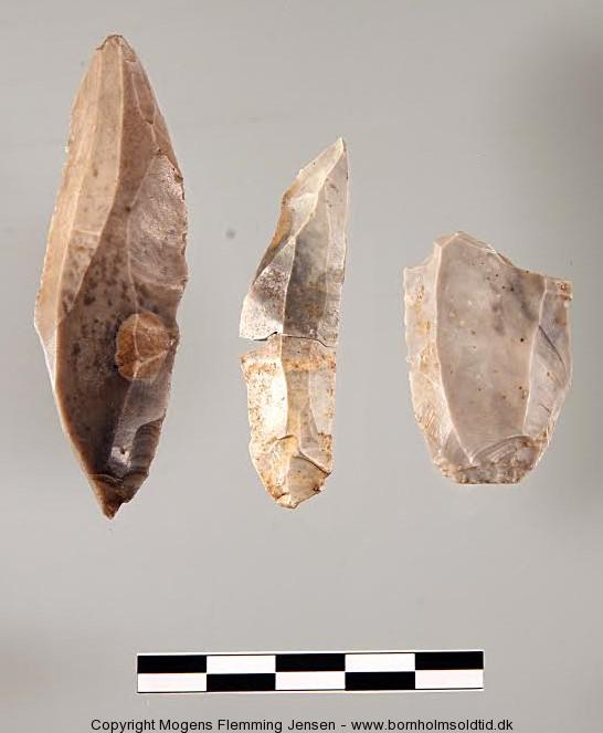 Ved udgravning omkring Vallensgårdmosen i Åker, blev der fundet en flækkeblok, en skrabe beregnet til at rense skind med og flintafslag. Udstillet på Bornholms Museum.