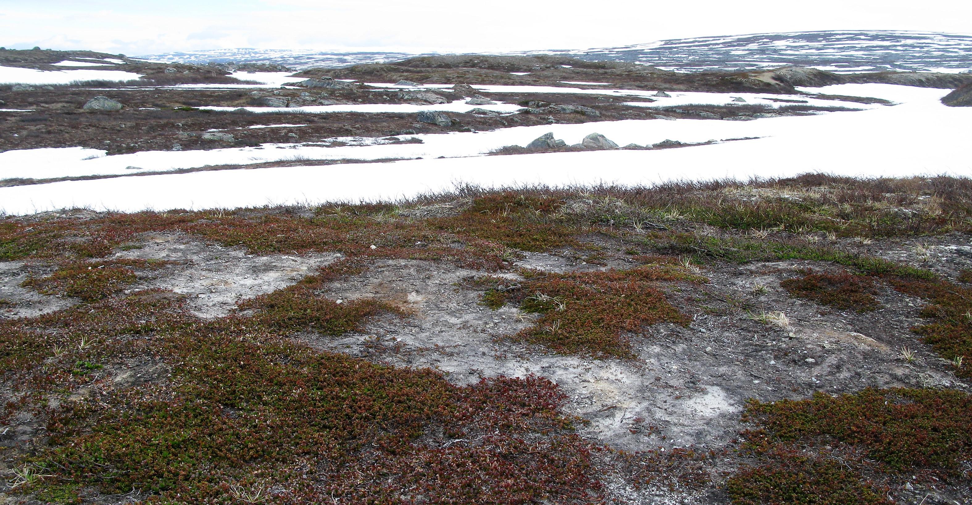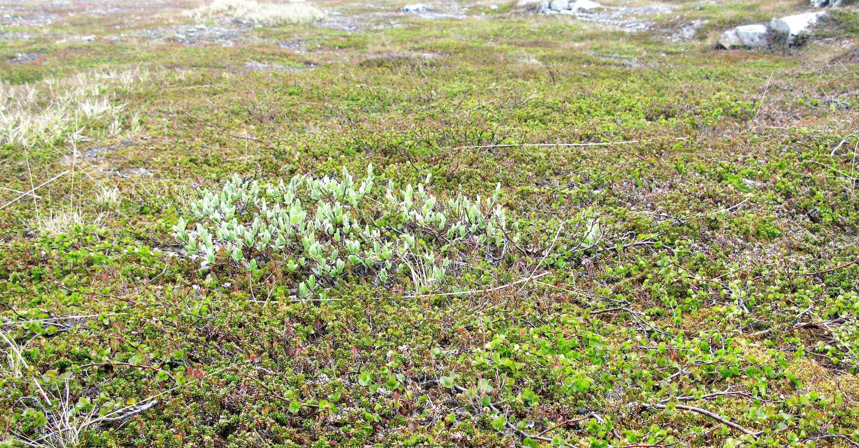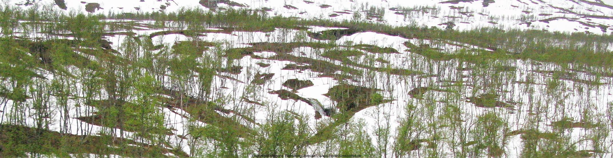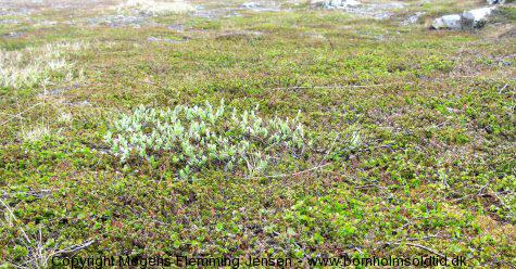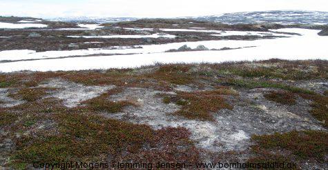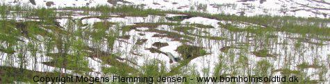 Herover ses et foto fra Polarcirklen i Norge. På Bornholm for 14.000 år siden var plantevæksten den samme, med lav pil og andre hårdføre planter der kunne klare sig i undergrundens permafrost (permanent frost i undergrunden).