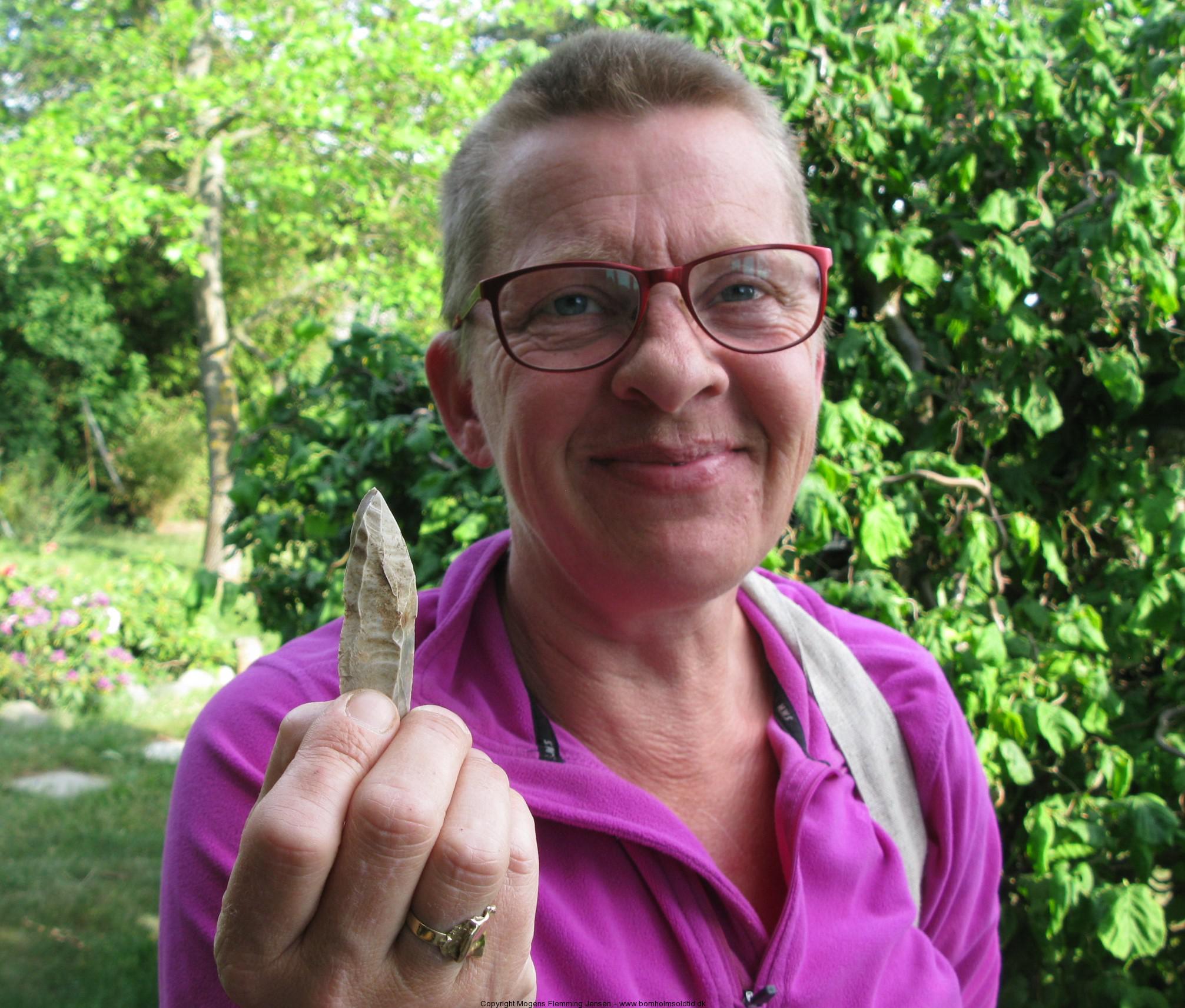 Herover ses Pernille, den glade finder af det sjældne flinteredskab. Stikkelens spids holdes opad. Herunder ses et nærbillede af den nyfundene stikkel. Stikkelen blev anvendt som et universalværktøj, den venstre ende (se fotoet herunder) blev anvendt som kniv og har spor af slidtage, den højre ende blev anvendt som høvl, til skrabning og som bor.