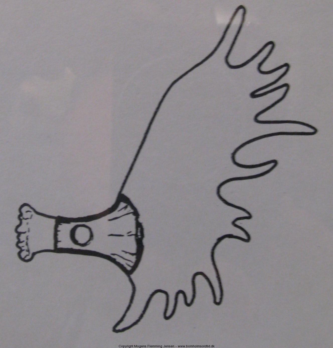 Tegning fra Bornholms Museums udstilling. Illustrationen herover viser hvorfra på elsdyr-takken, øksen er taget.