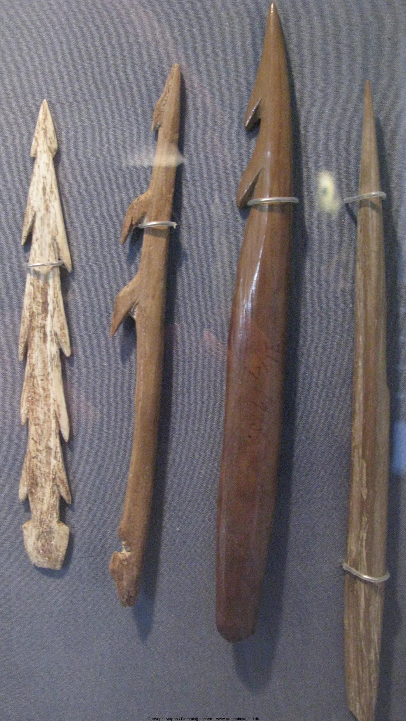Fire harpuner blev under tørvegravning fundet i Vallensgårdmosen. Den dobbelttandede til venstre er ældst, de 3 til højre er yngst og har formodentligt indgået i en lyster-en slags Ålejern. Udstillet på Bornholms museum.